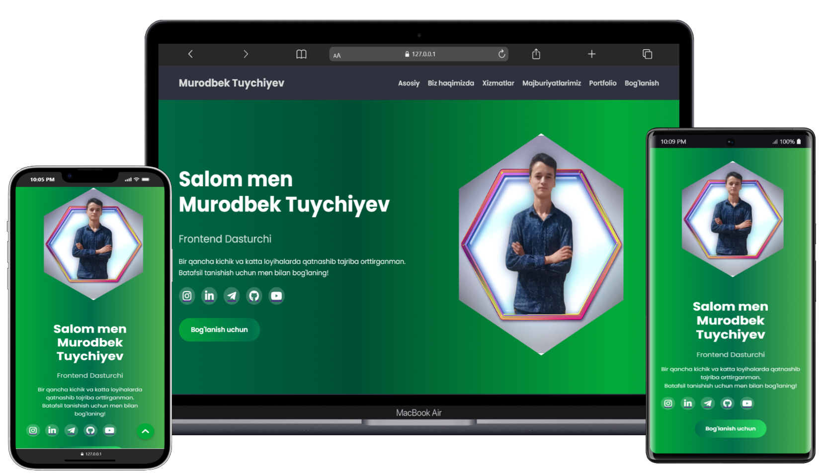 Murodbek Tuychiyev - bu professional veb-saytlarni loyihalash, logotiplar va ijtimoiy media tarkiblari uchun grafik dizayn, shuningdek SEO optimallashtirishga ixtisoslashgan kompaniya. Sizning onlayn loyihalaringiz sizning biznesingiz muvaffaqiyatining kaliti ekanligiga ishonamiz va biz sizga onlayn maqsadlaringizga erishishda yordam berishga qaror qildik. Bizning tajribali va ist'dodli jamoamiz bilan sizga kuchli onlayn loyihalar yaratishga va boshqalardan ajralib turishga yordam beradigan yuqori sifatli xizmatlarni taklif etamiz. Sizga qanday yordam berishimiz mumkinligi haqida ko'proq bilish uchun bugun biz bilan bog'laning.